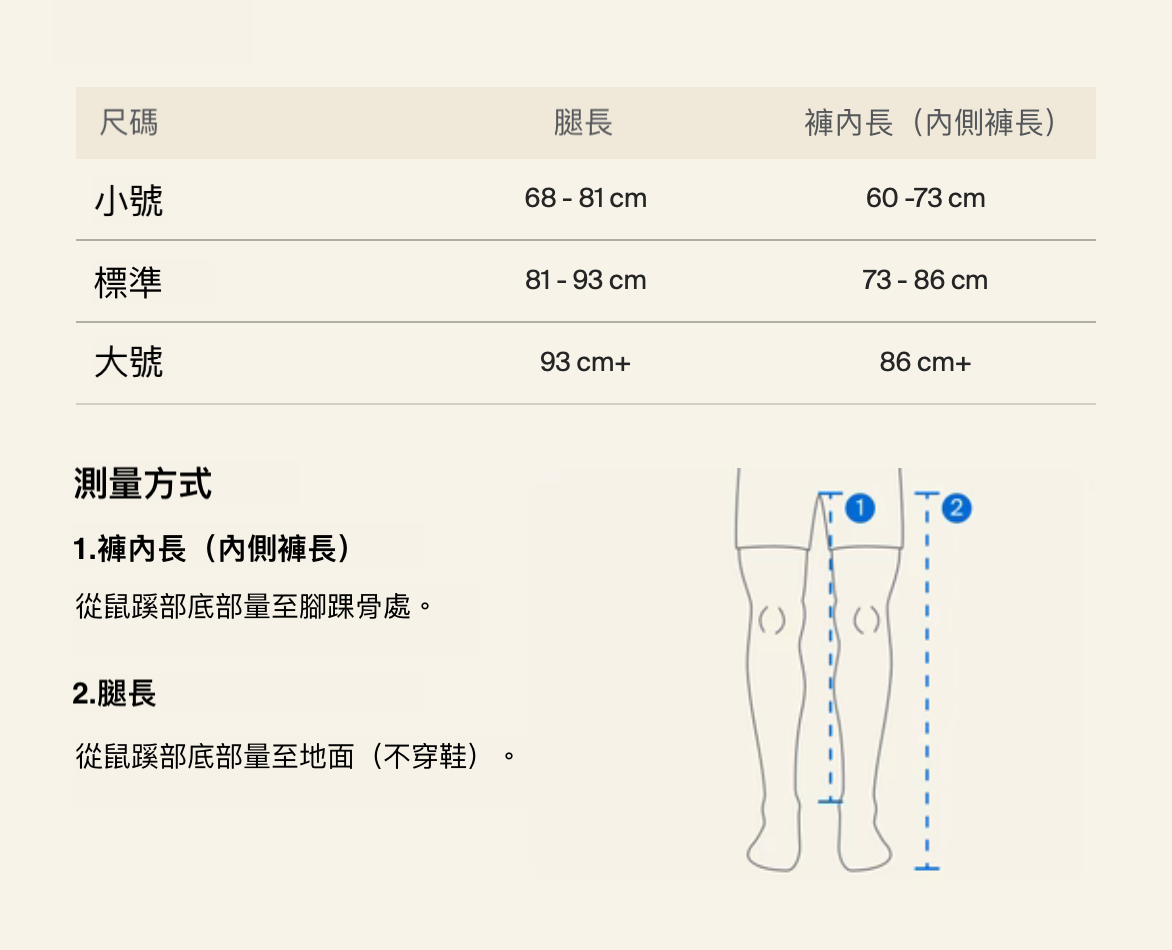 為了確保 JetBoots Prime 氣壓腿套的合適穿戴,請先測量您的褲內長:從鼠蹊部底部至腳踝骨的距離。接著,再測量腿長:從鼠蹊部底部至地面(赤腳測量)。若您的尺寸介於兩個尺寸之間,我們建議選擇較小的一號,以獲得更貼合的體驗。